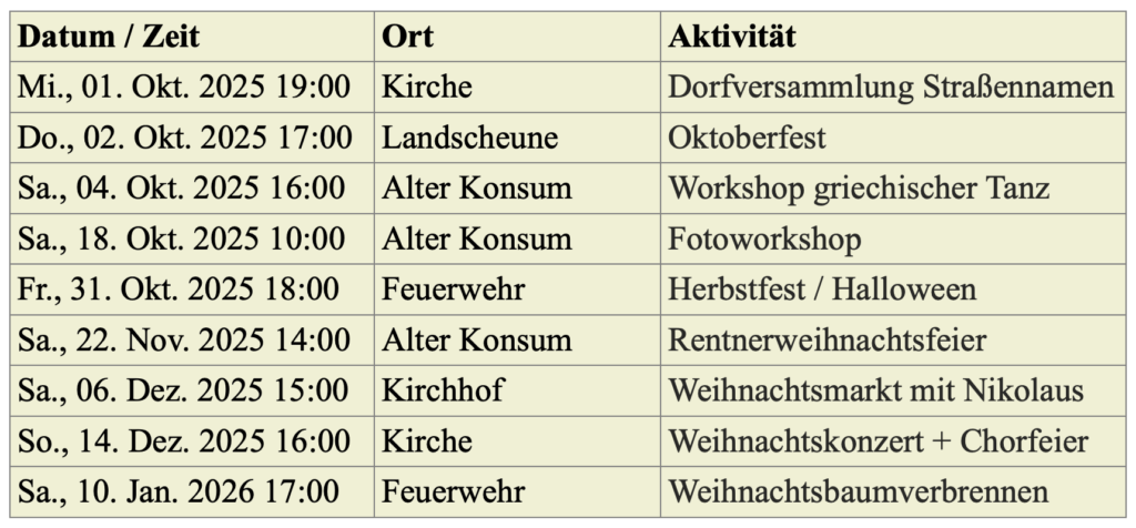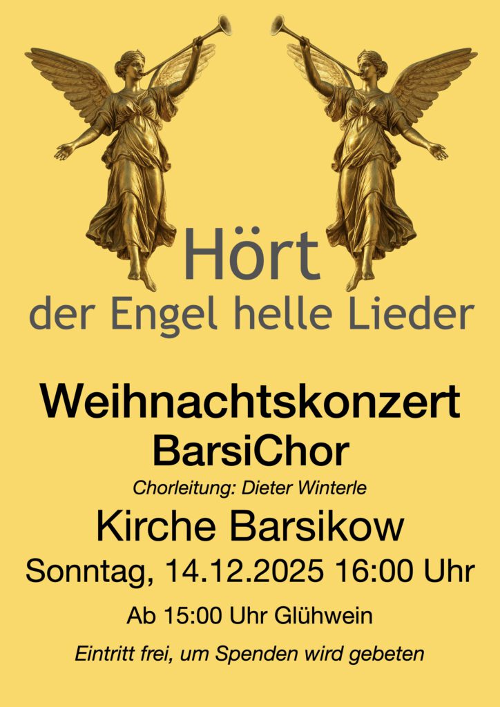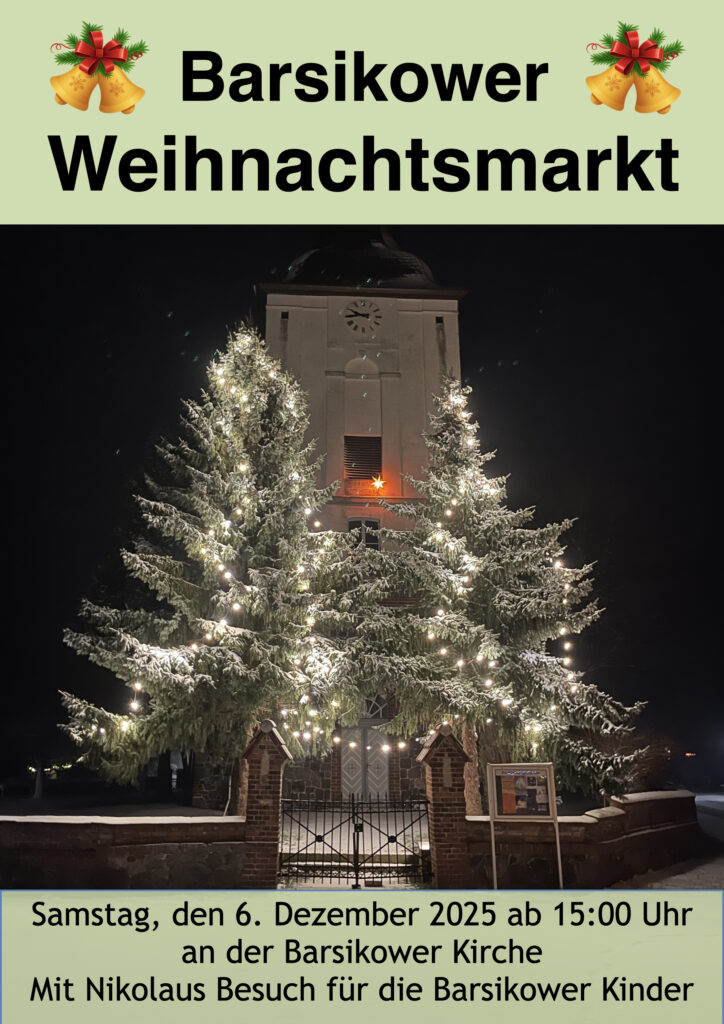 Feste Termine Wöchentlich: jeden Dienstag 17:00 – 18:00 Uhr in der Feuerwehr: FrauensportgruppeWöchentlich: jeden Mittwoch 16:00 – 17:00 Uhr Sport für reife Männer (Park Barsikow). März-OktoberWöchentlich: jeden Donnerstag 19:00 Uhr in der Feuerwehr: Proben BarsiChorWöchentlich: jeden Donnerstag 16:00 Uhr in der Feuerwehr: Tischtennis für alle, ohne AnmeldungWöchentlich: jeden Freitag 18:00 – 21:00 Uhr im Alten Konsum: Begegnungscafé (Siehe Webseite www.alterkonsum.de) Samstag, den 06.12.2025, 15:00 Uhr An der Dorfkirche: Weihnachtsmarkt mit Besuch Nikolaus für die Kinder Sonntag, den 14.12.2024 16:00 Uhr Dorfkirche: Weihnachtskonzert "Hört der Engel helle Lieder" mit dem BarsiChor Samstag, den 10.01.2026 17:00 Uhr Feuerwehr: Weihnachtsbaumverbrennen Weihnachtsbaumverbrennen 18.01.2025
